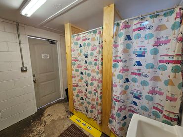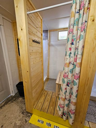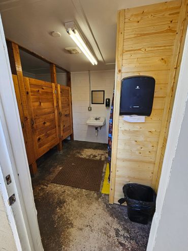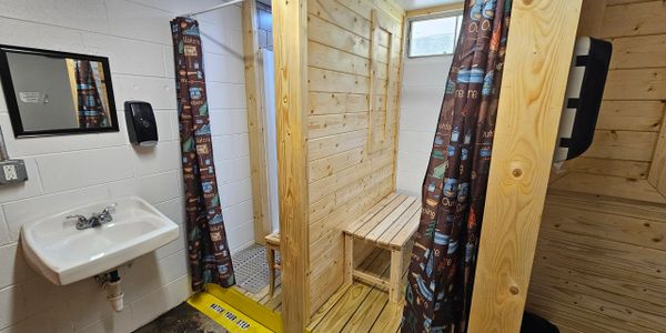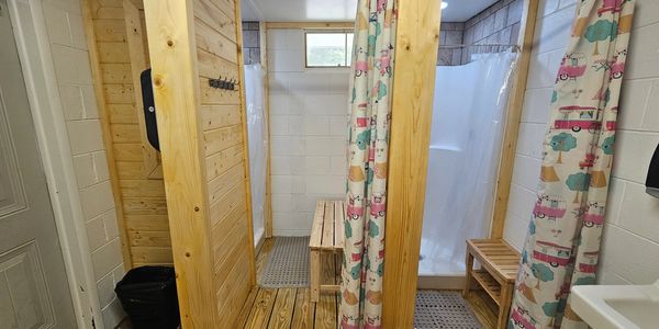 Main bath house located in the heart of the park. Both men's and women's available on each side, with each containing 3 private stalls and 2 private showers.