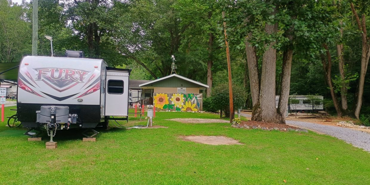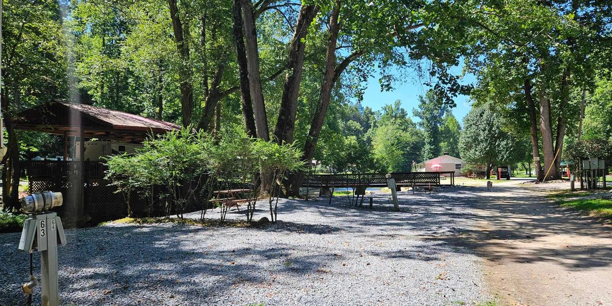 Please note that we were affected by Hurricane Helene in fall of 2024. Helene took out our walking bridge at sites 64-66. As of right now we do not have plans to rebuild the bridge but will be working on removing the pillars in the water to make wading/tubing easier for all to enjoy.