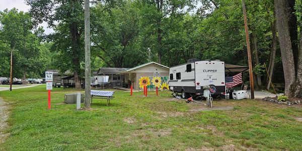 Site 73 (30 amp) is facing the creek and is $45/night + tax. Site 74 (50 amp) is directly behind site 73 and is facing the campground road (camper is in site 74 in this photo) and is $55/night + tax. Both sites are in front of the bath house and are closest to the campstore/office. Both sites can easily be pull through.